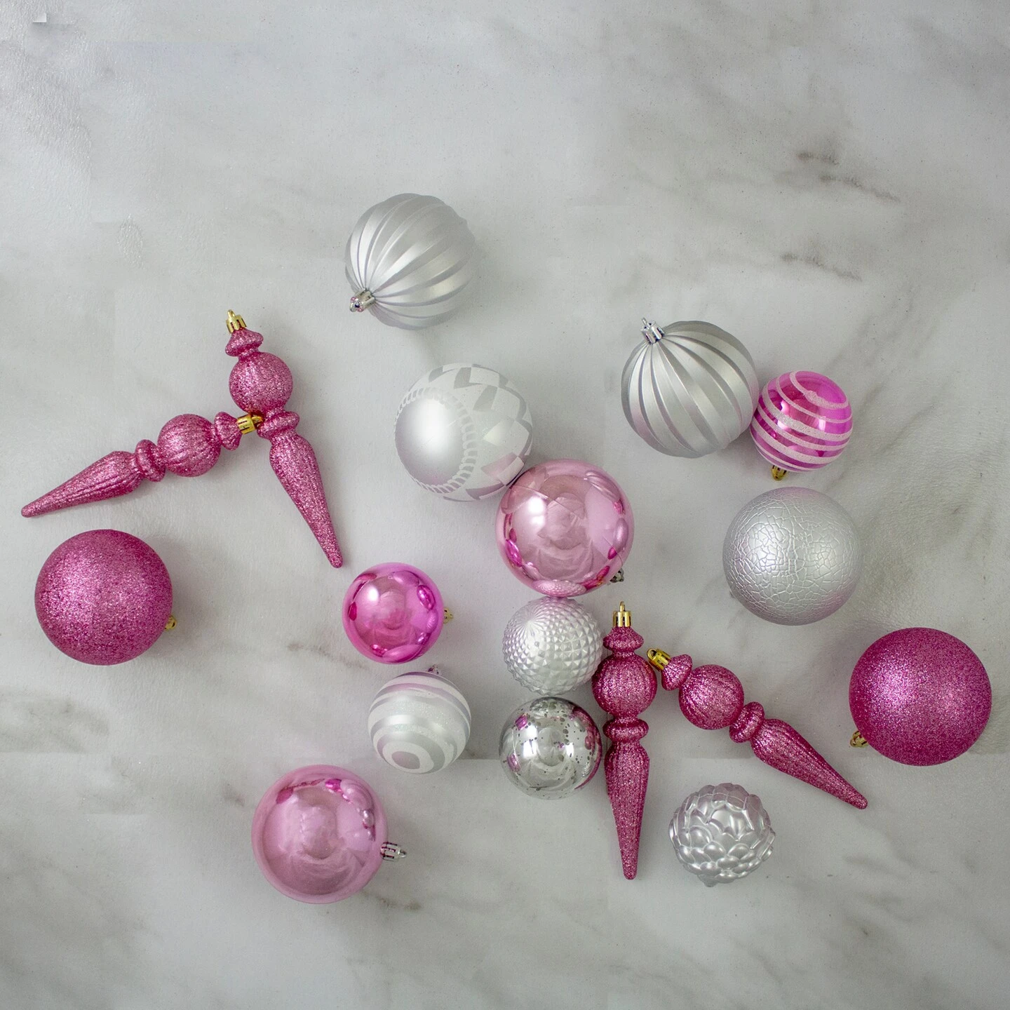 This amazing array of ornaments is done in pink and silver with a mixture of matte, shiny and glitter finishes. This special club pack will allow you to build your collection quickly. It includes everything you will need to decorate your Christmas tree. Shatterproof ornaments combine the beauty and luster of real glass with the unbreakable practicality of plastic.