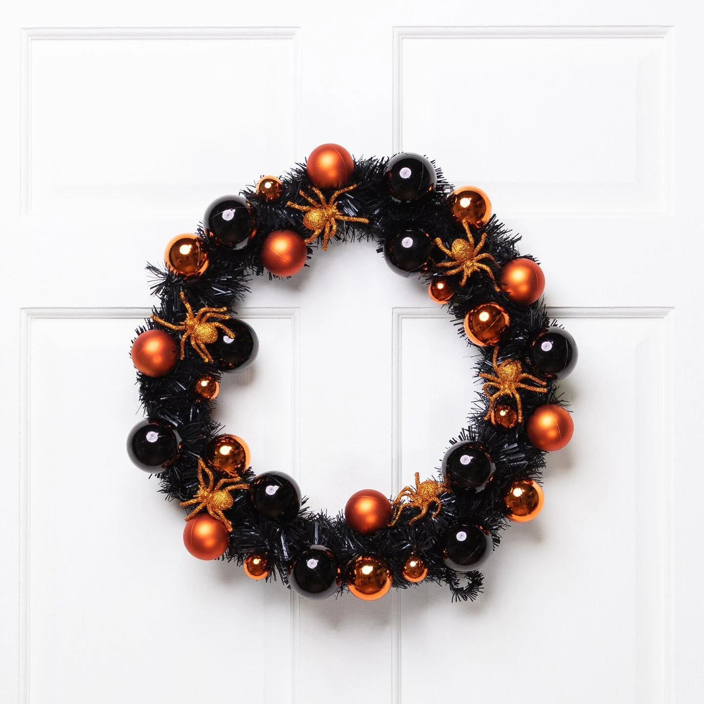 Spread an authenticated Halloween vibe to your surroundings by hanging this wreath on your doors, windows, or walls. This spooky black wreath features orange-glittered spiders and black and orange ornaments. It will make a great addition to your Halloween decor this season.