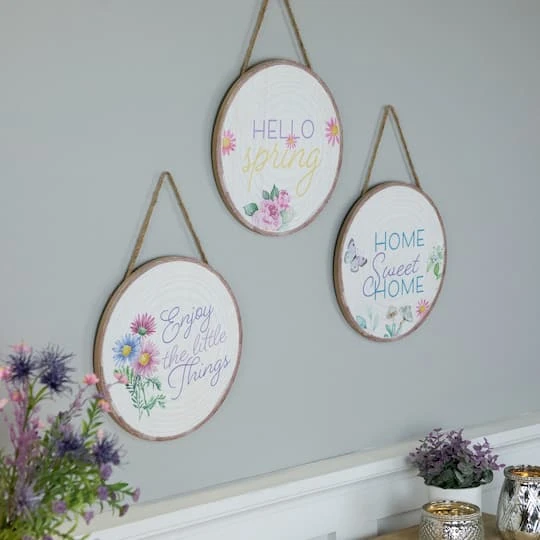 Add a light and airy feel to your seasonal décor with this set of hanging wall signs. The signs read “Hello Spring,” “Enjoy the Little Things” and “Home Sweet Home.” Each sign is made to look like freshly cut wood and the floral design makes them perfect for welcoming the warmer months.