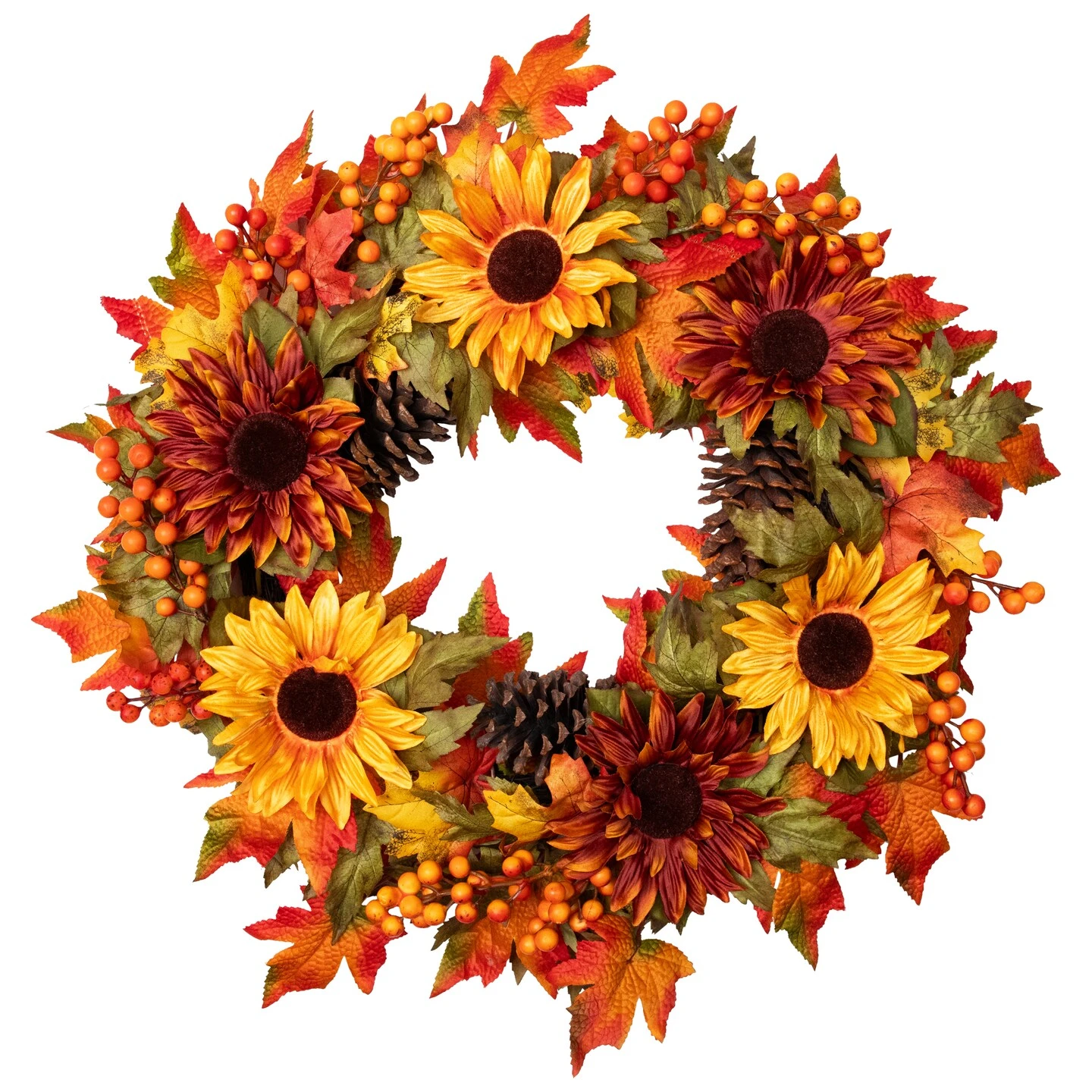 This gorgeous harvest wreath provides all the wonderful colors of Autumn. Foliage in multi hue is the backdrop for colorful sunflowers, berries, and real pine cones. Perfect for hanging or used as part of your Thanksgiving table centerpiece.
