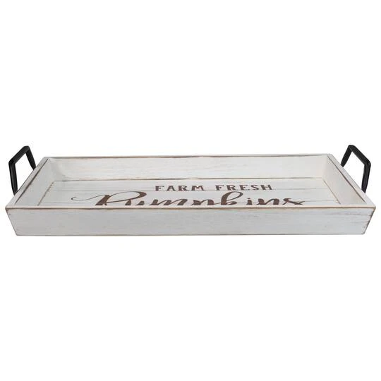 Add this wooden tray to your Thanksgiving feast this year! The sign is white with brown writing that reads “Farm Fresh Pumpkins” with leaves and a pumpkin that will make your meal serving complete. You could use this tray for assistance with serving a meal or a piece of Autumn décor for your home.