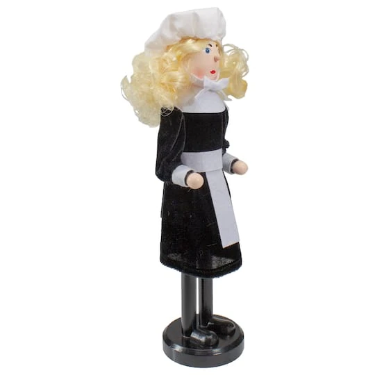 Add a new twist to your fall holiday décor with this pilgrim woman nutcracker. She features a black petticoat and waistcoat with a white apron and bonnet ready to go harvest some food.